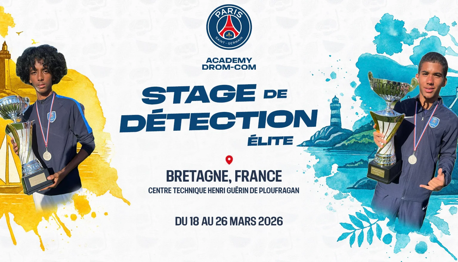 La Paris Saint-Germain Academy DROM-COM est fière d’annoncer la tenue de son Stage de Détection Élite U14-U17, du 18 au 26 mars 2026, au Centre Technique Henri Guérin de Ploufragan, en Bretagne.